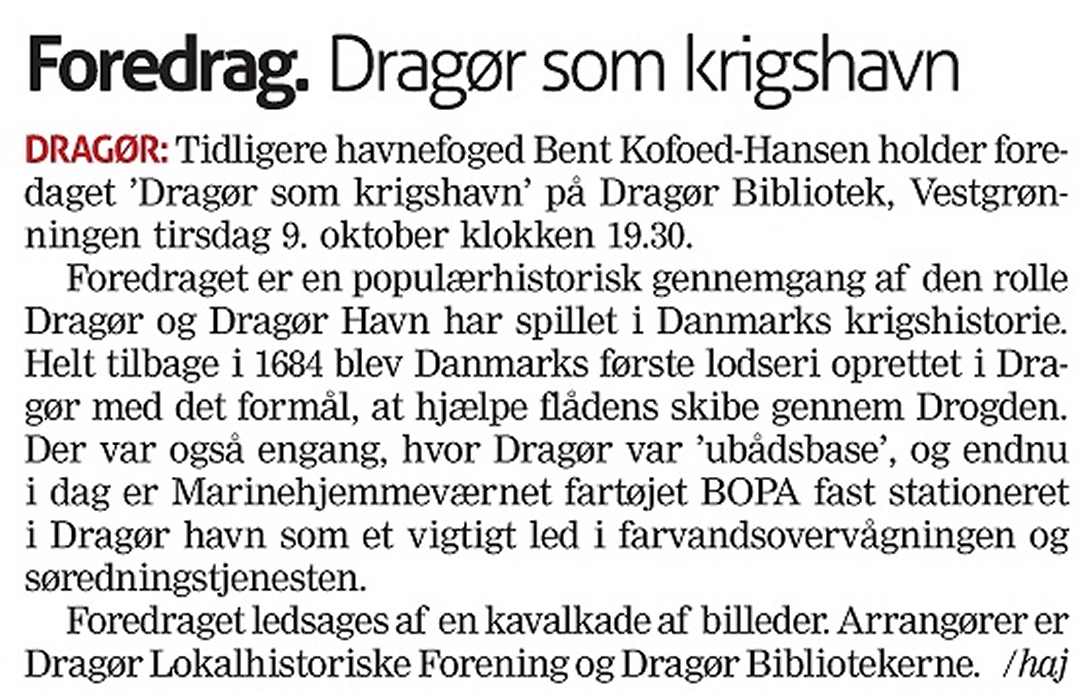Tv. 2. oktober 2012 omtaler Amager Bladet foredraget. Th. 9. oktober 2012. Formanden Kurt Mathisen takker Bent Kofoed-Hansen for et flot foredrag.
